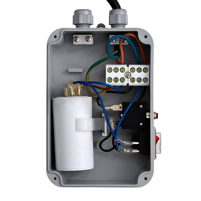- Кабельные вводы блока надежно обжимают кабели, а само устройство защищено от водяных брызг и может быть установлено как внутри, так и снаружи помещений. Однако при круглогодичном использовании насоса, желательно разместить конденсаторный блок в помещении с нормальным уровнем влажности.