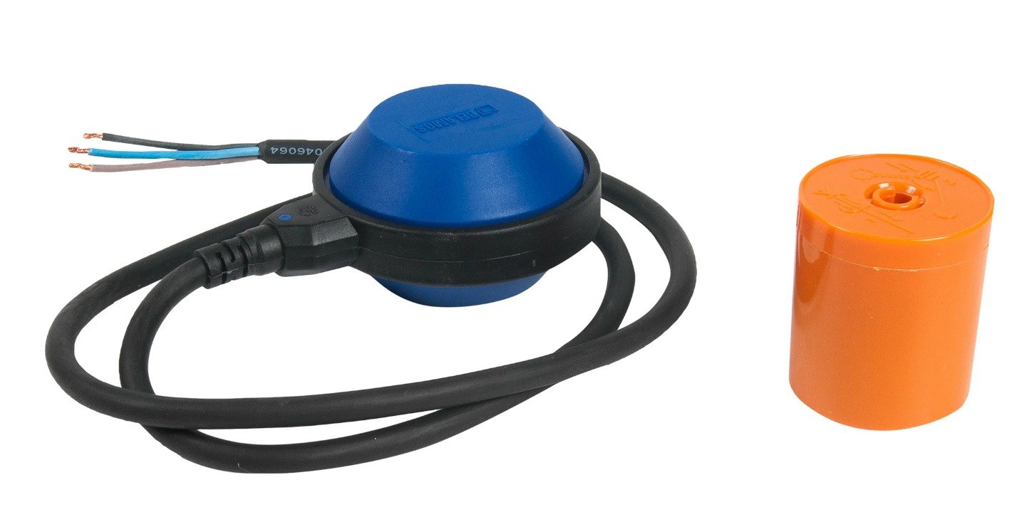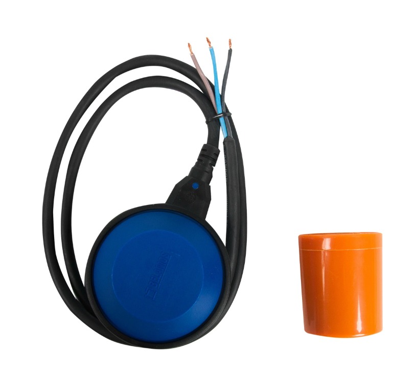 Поплавковый выключатель состоит из плавающей пластиковой коробки. Внутри этой коробки находится электрический переключатель и стальной шарик, который при изменении положения поплавка замыкает (или размыкает) контакты переключателя. От переключателя выходят кабель с тремя проводами (обычно это коричневый, синий и черный цвета): один общий и два от нормально закрытого и нормально открытого контактов переключателя.