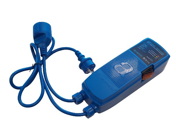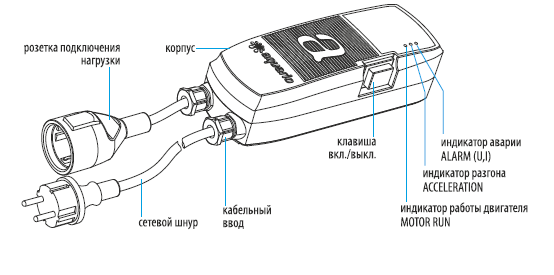 Устройство оборудовано сетевым кабелем с вилкой для подключения к источнику электроснабжения и розеткой для подключения нагрузки.
