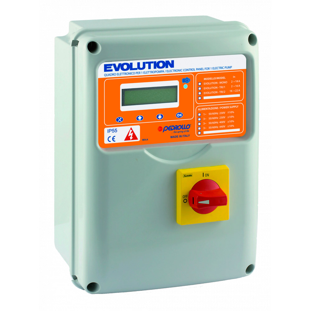 Pedrollo EVOLUTION TRI/2 — пульт управления для трёхфазных четырёх- и шестидюймовых скважинных насосов (с регулировкой мощности). Пульт обеспечивает регулировку тока срабатывания защиты от перегрузок и короткого замыкания и контролирует значение cosφ, чтобы предотвращать работу насоса «всухую». Рассчитан на подключение поплавка или реле давления. Корпус изготовлен из самогасящегося термопластика.