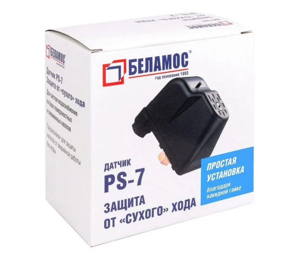 Реле сухого хода Belamos PS7 состоит из корпуса, внутри которого расположена нормально разомкнутая контактная группа, управляемая мембраной. Внутри корпуса расположена кнопка(выведена наружу) для принудительного запуска насоса и винт регулировки давления выключения (на большой пружине). При нормальной работе насоса вода под давлением воздействует на мембрану, которая обеспечивает замыкание контактной группы и подачу электроэнергии на электродвигатель. При падении давления воды до величины давления выключения (0,01 - 0,5 МПа) контактная группа размыкается и отключает насос.