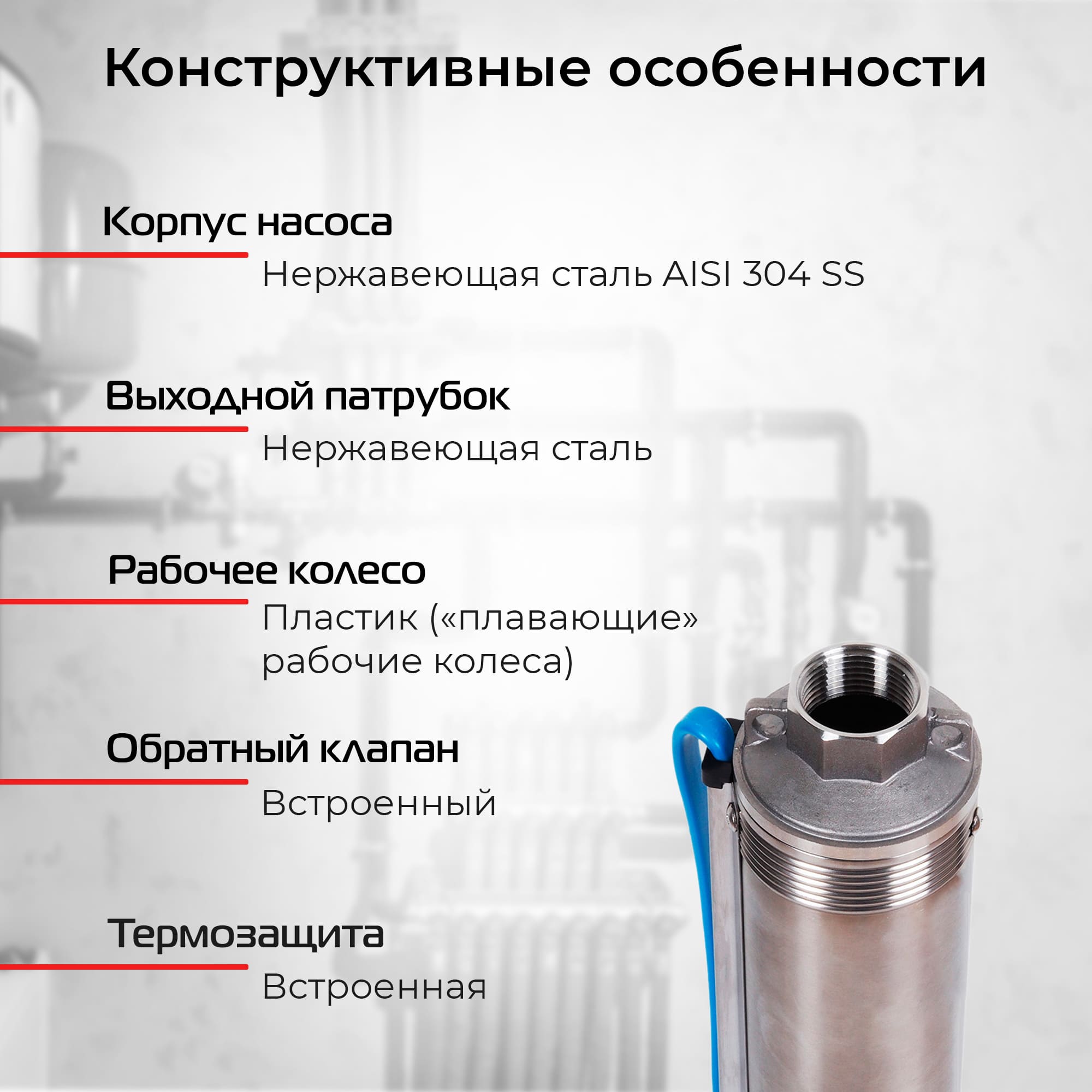 - Корпус насоса: нержавеющая сталь AISI 304 SS