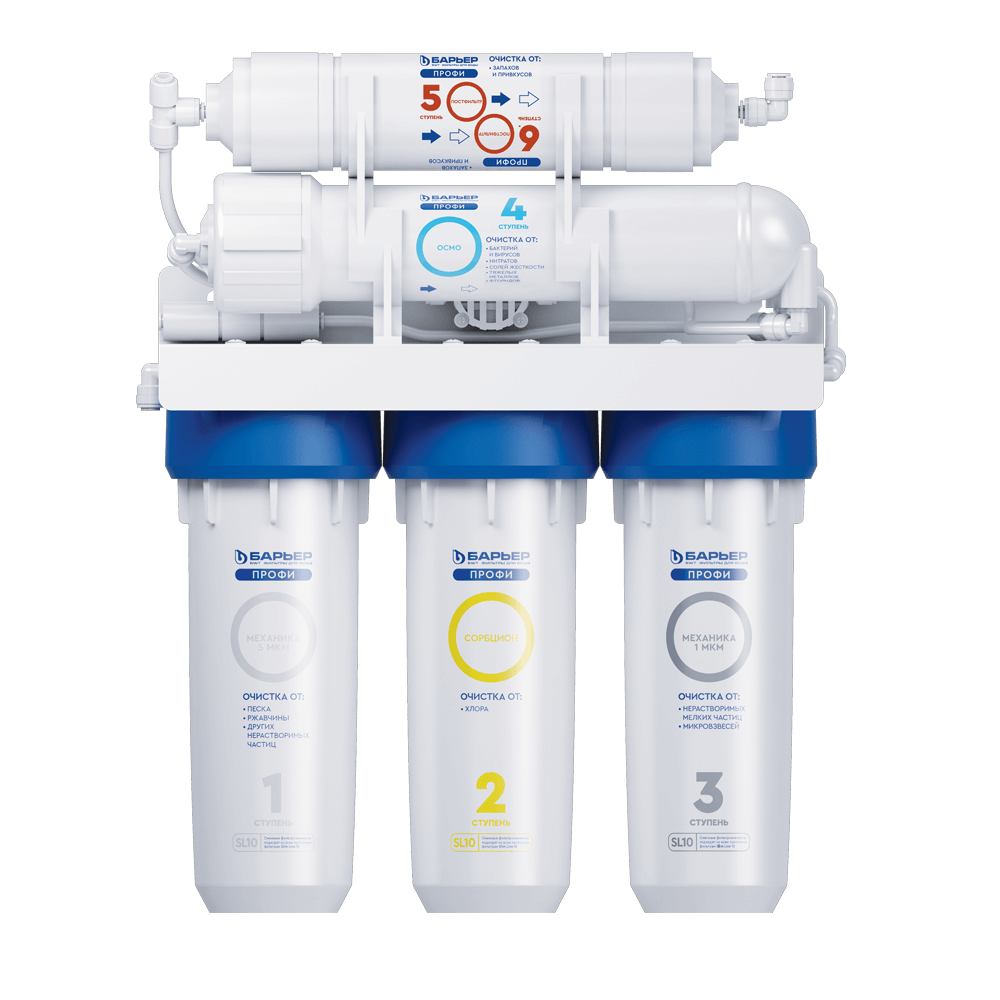 Пятиступенчатый фильтр обратного осмоса в корпусе классического исполнения.
