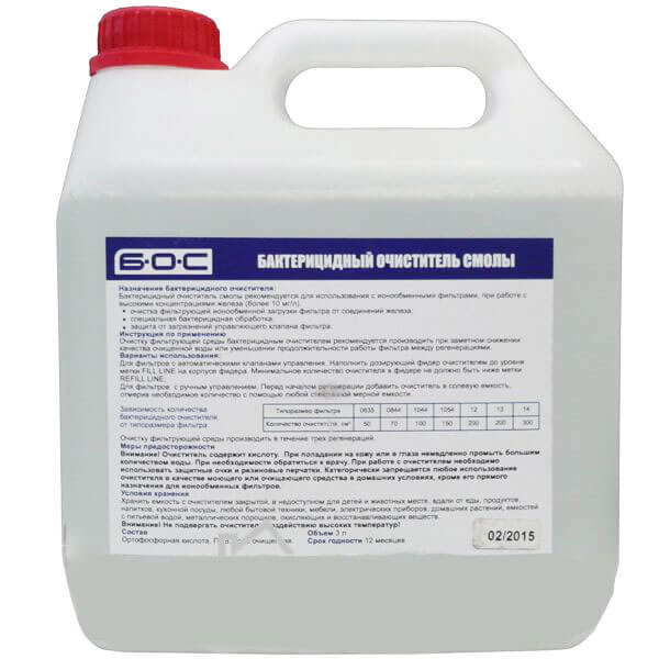 Бактерицидный очиститель смолы (БОС) рекомендуется для использования с ионообменными фильтрами. Предназначен для очистки гранул ионообменной смолы от оксидированного железа, её бактерицидной обработки, удаления осадков из клапана блоков управления фильтров.