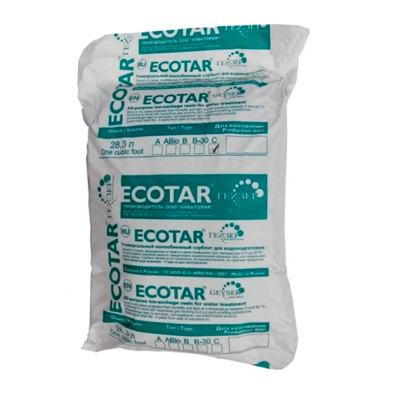 Экотар C – смесь катионообменных смол различного гранулометрического состава, крупнопористой анионообменной смолы и инертной смолы для очистки воды с высоким содержанием природных органических соединений, в том числе железа и марганца. Рекомендуется применять для очистки воды из неглубоких скважин, колодцев, открытых поверхностных источников.