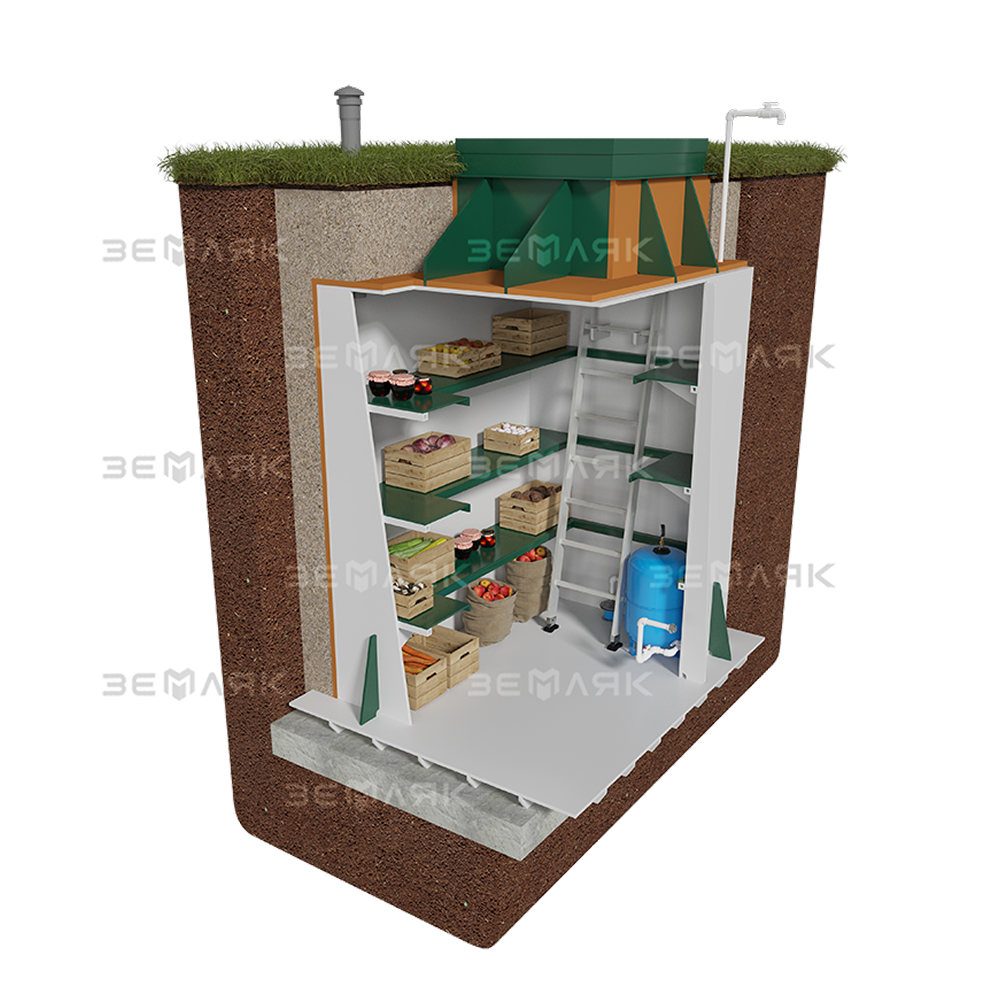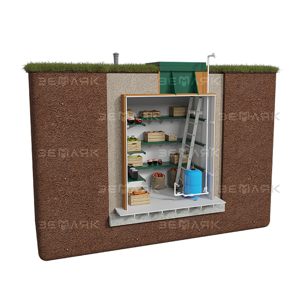 Погреб-кессон «ЗЕМЛЯК» представляет собой герметичный подземный павильон, предназначенный для защиты устья скважины и размещения оборудования автоматического управления и защиты насоса, систем водоподготовки, узлов распределения водопроводной сети и вывода поливочного крана. Погреб-кессон «Земляк» предназначен для использования на приусадебных участках, в загородных домах и коттеджах.