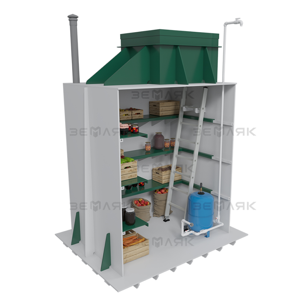 Погреб-кессон «ЗЕМЛЯК» представляет собой герметичный подземный павильон, предназначенный для защиты устья скважины и размещения оборудования автоматического управления и защиты насоса, систем водоподготовки, узлов распределения водопроводной сети и вывода поливочного крана. Погреб-кессон «Земляк» предназначен для использования на приусадебных участках, в загородных домах и коттеджах.