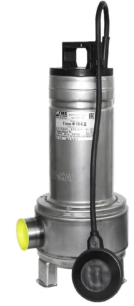 Насосы Гном Ф – погружные фекальные электронасосы с нержавеющим корпусом переносные (с ручкой). Насосы ГНОМ Ф - дренажные, канализационные, предназначены для перекачивания бытовых и промышленных загрязнённых жидкостей температурой до 35 °С, с содержанием различных неабразивных взвешенных частиц размером до 50 мм в диаметре. Насосы изготовляются из материалов, устойчивых к агрессивным моющим средствам, присутствующим в стоках.