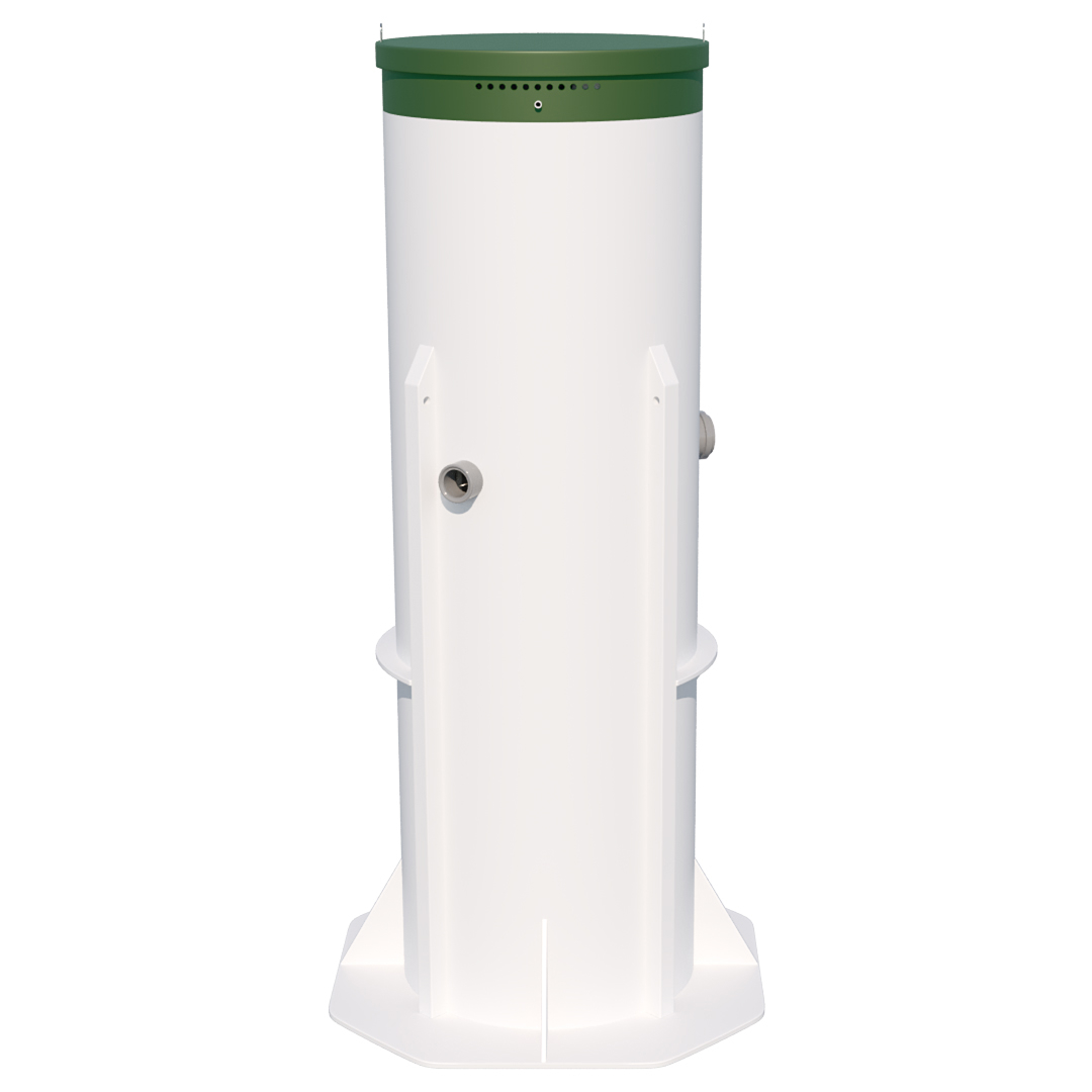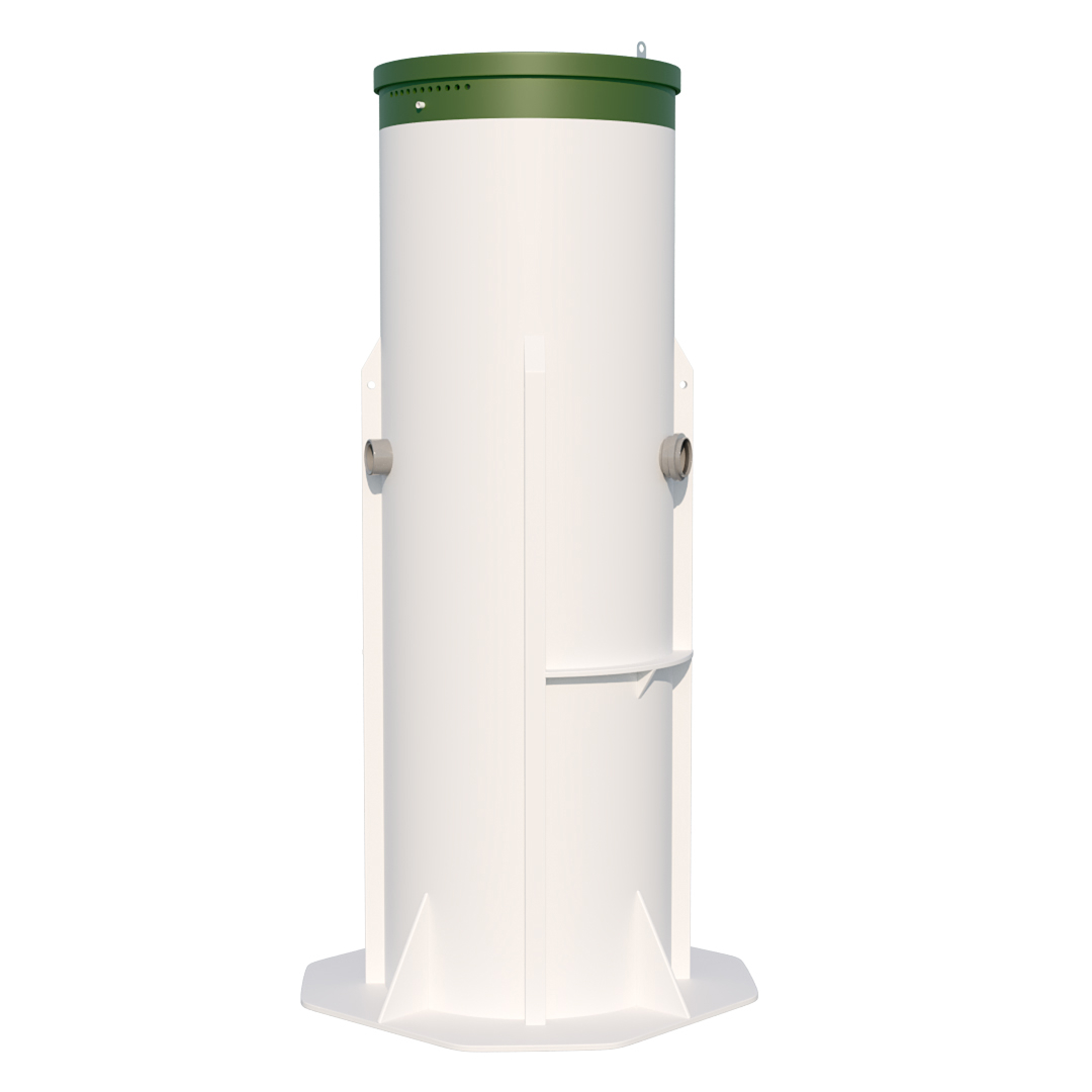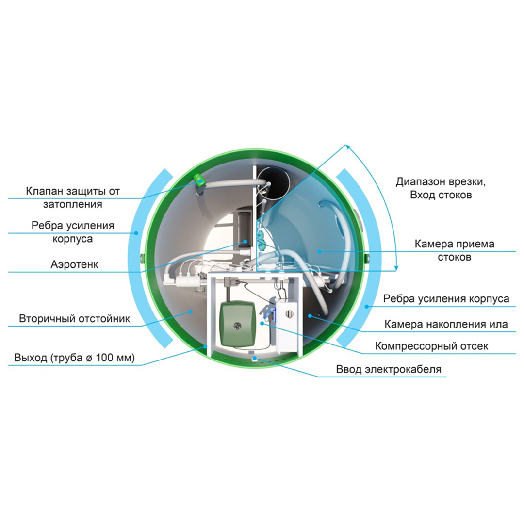 Горловина станции оборудована компрессорным отсеком. Здесь размещены компрессоры и розетки, чтобы подсоединять к электропитанию электрооборудование. Распределительно-регулировочный узел размещён на внешней стороне стенки камеры с компрессорами. Из него идут воздуховоды к каждому потребителю станции автономной канализации.