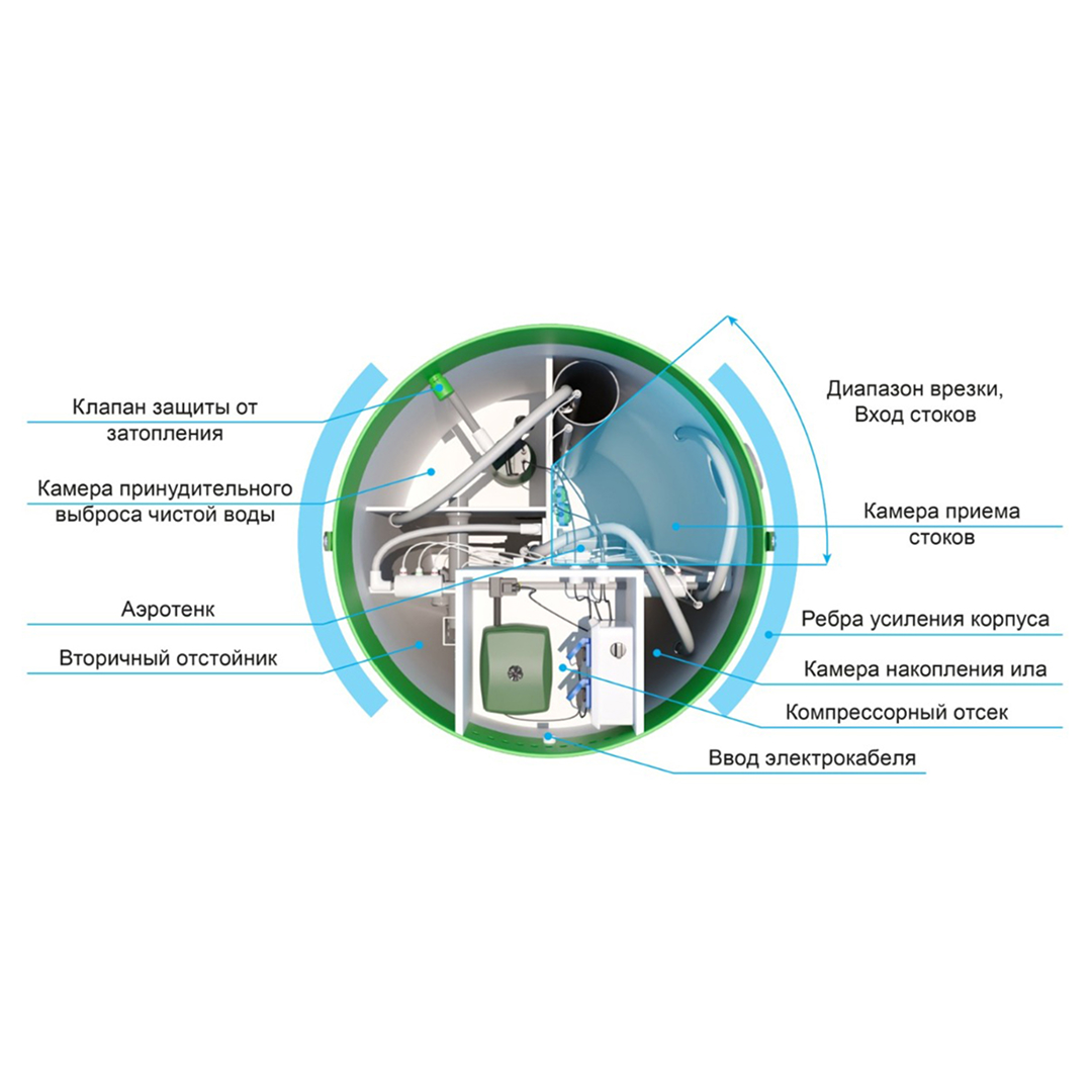 Горловина станции оборудована компрессорным отсеком. Здесь размещены компрессоры и розетки, чтобы подсоединять к электропитанию электрооборудование. Распределительно-регулировочный узел размещён на внешней стороне стенки камеры с компрессорами. Из него идут воздуховоды к каждому потребителю станции автономной канализации.