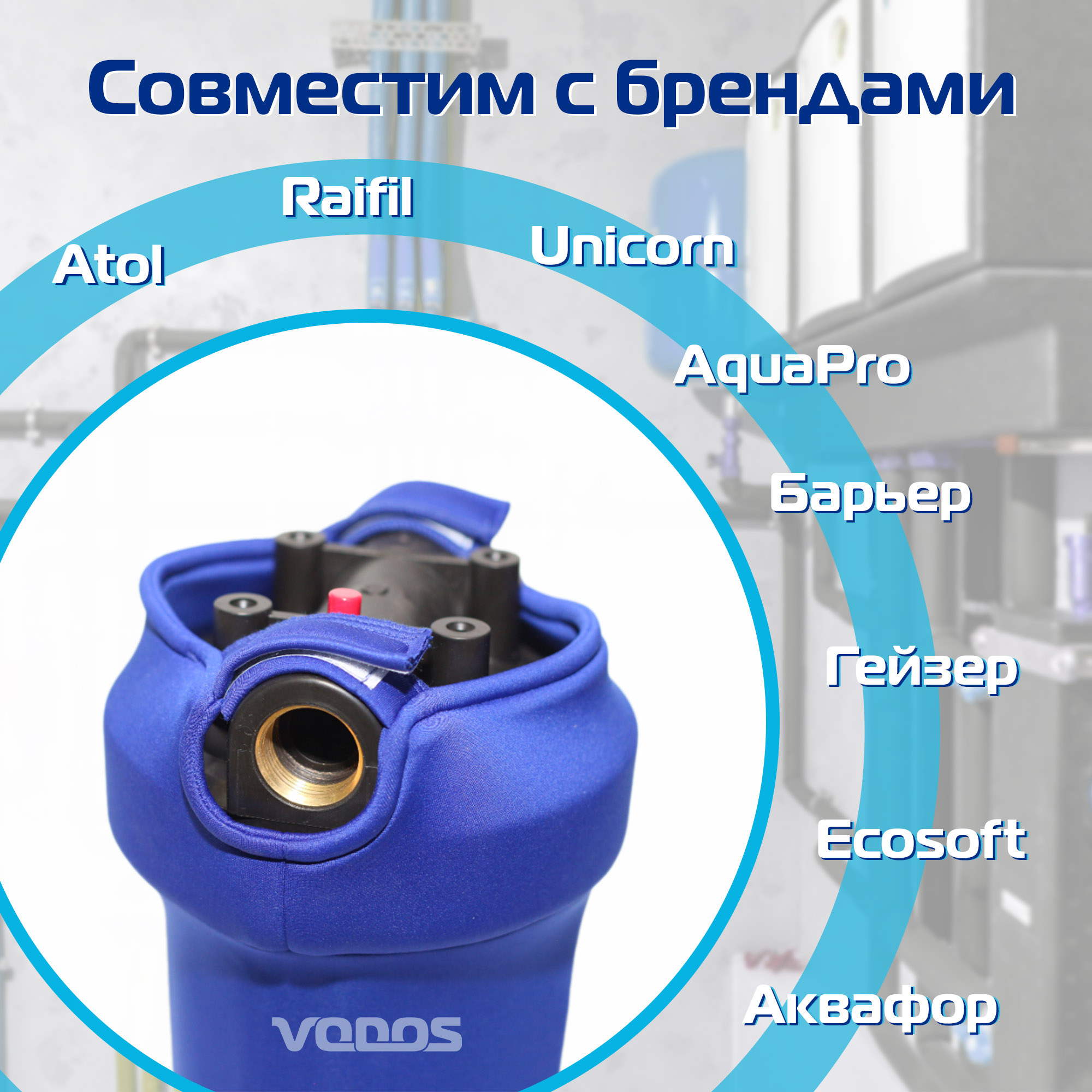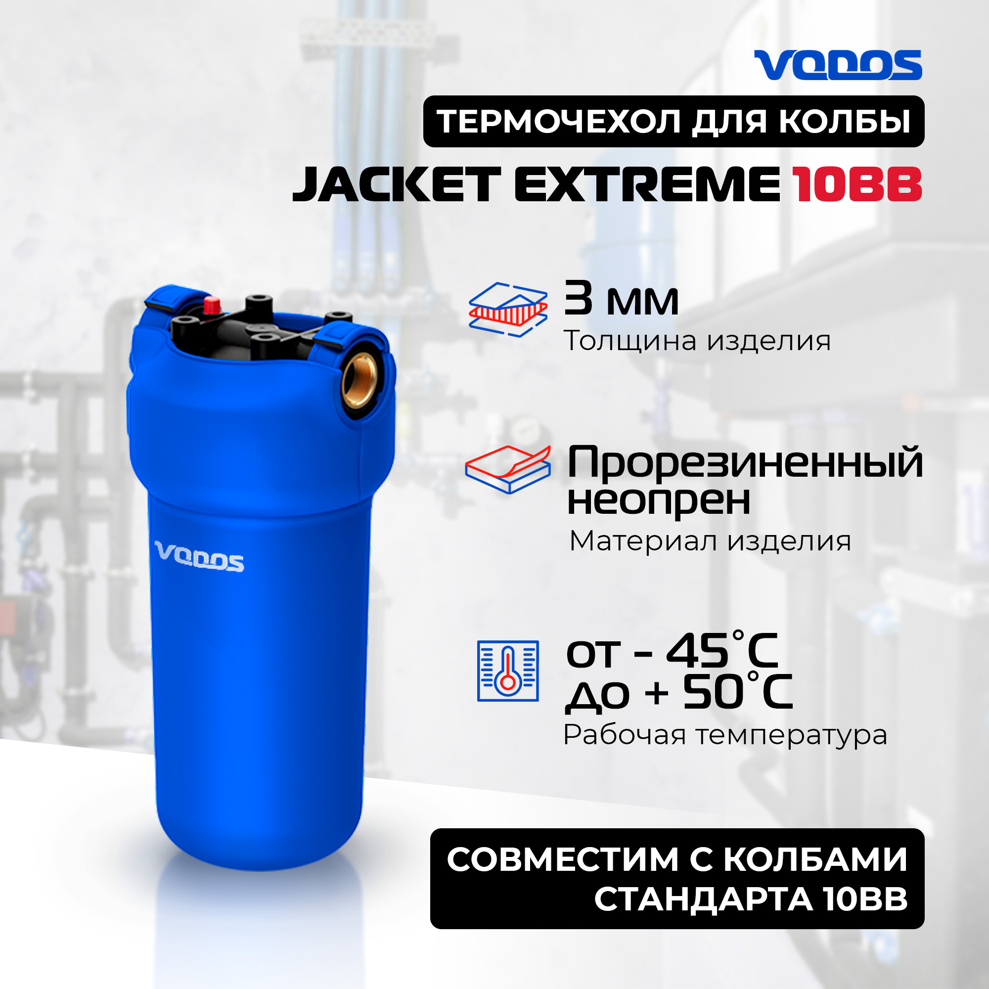 Термочехол VODOS Jacket EXTREME 10BB предназначен для защиты колбы фильтра типоразмера 10BB от конденсата, пыли и механических повреждений.