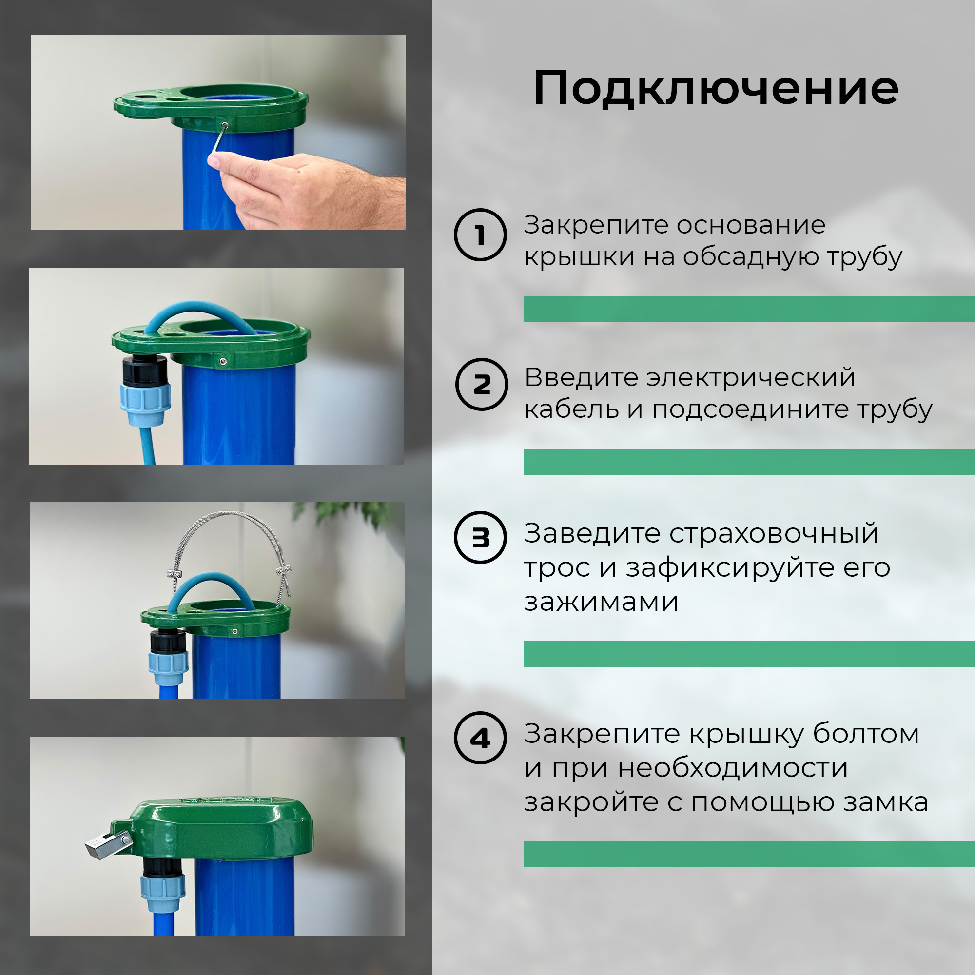 Крышка поддерживает внутри скважины естественный уровень воды за счет сетчатого фильтра, который предохраняет скважину от вакуумирования. Крышка защищает скважину и насос от краж и вандализма. Помогает правильно расположить насос внутри скважины. Надежно удерживая трос, предохраняет от падения насоса в скважину.