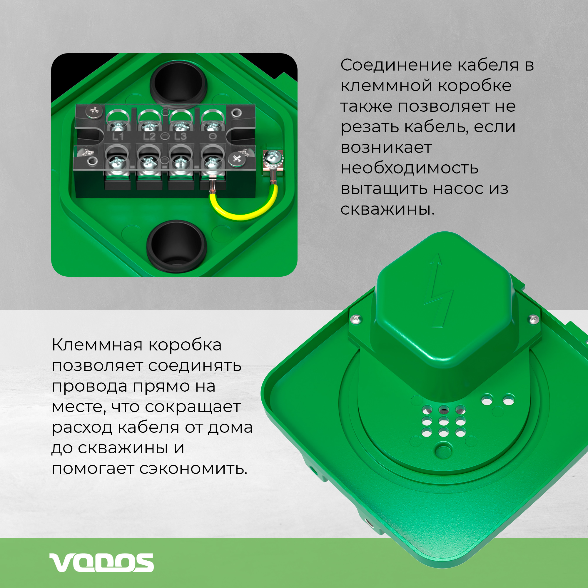 Универсальная алюминиевая крышка Vodos для скважины со встроенной клеммной колодкой для быстрой и легкой коммутации внешних проводов с проводами внутри скважины, питающими погружной скважинный насос. Наличие электрического блока позволяет быстро произвести диагностику насоса и питающей линии.